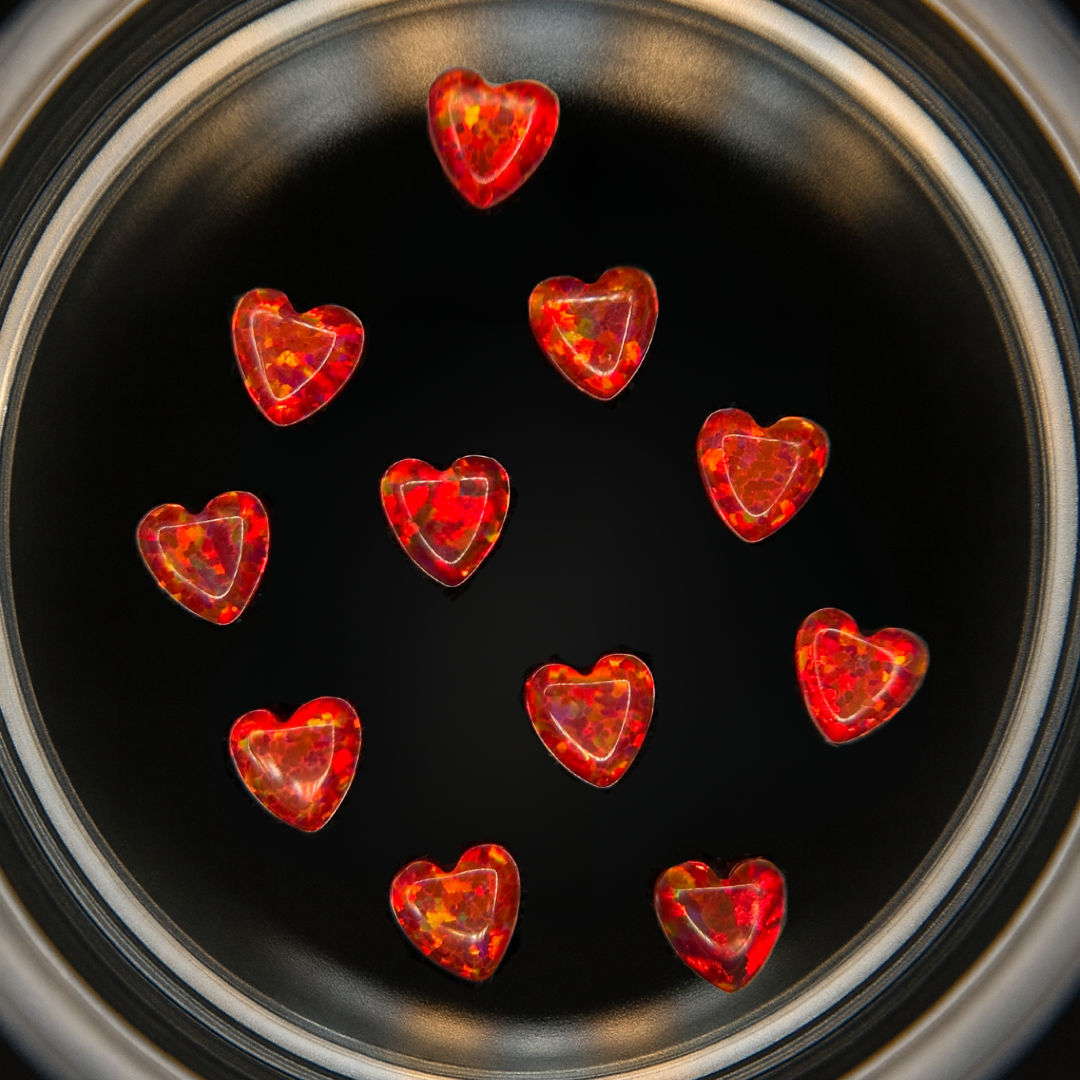 Heart opals, lab-created and cut from Cabochon Opal — considered the highest quality opal in the world. Their curved profile and ultra-thin finish allow for more aesthetic, comfortable, and precise bonding.