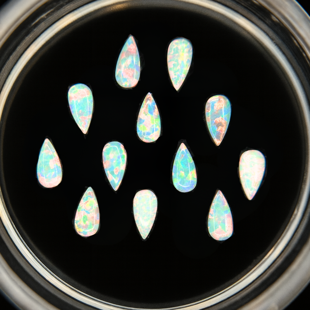 Tear opals, lab-created and cut from Cabochon Opal — considered the highest quality opal in the world. Their curved profile and ultra-thin finish allow for more aesthetic, comfortable, and precise bonding.