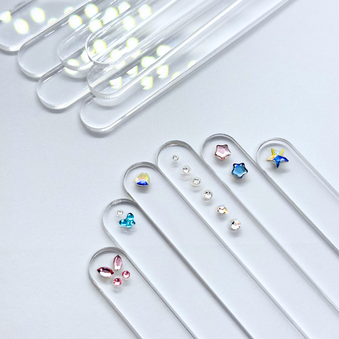 Una herramienta práctica y muy demandada para mostrar gemas dentales antes de su aplicación. Estos palos acrílicos están pensados para pegar gemas y acercarlas a los dientes del cliente, permitiéndoles visualizar el resultado final antes de tomar una decisión.